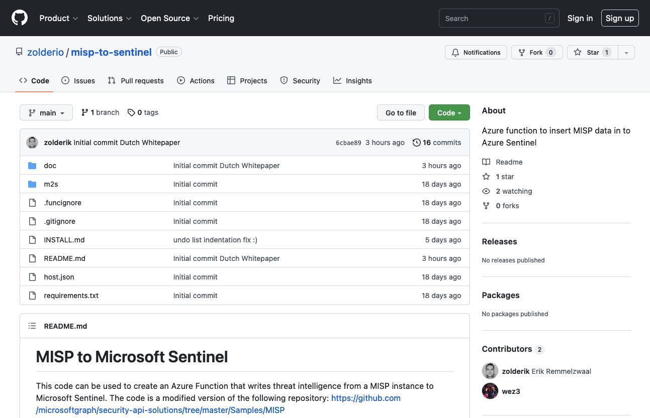 In deze GitHub repository hebben wij de code beschikbaar gesteld om in een eigen Microsoft tenant een Azure Function te bouwen die in interval dreigingsinformatie uit een MISP bron download en wegschrijft naar 1 of meerdere Microsoft Sentinel instanties.