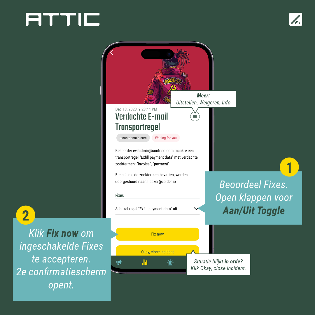 We hebben de pagina met incidenten in de mobiele en web versie van Attic grondig onder handen genomen. De directe aanleiding hiervoor was dat door de introductie van Sentinel, het waarschijnlijker wordt dat bij 1 incident meerdere fixes worden geadviseerd. Bijvoorbeeld het verwijderen van aan bepaald artifact, in combinatie met het uitschakelen van een gebruikersaccount.
